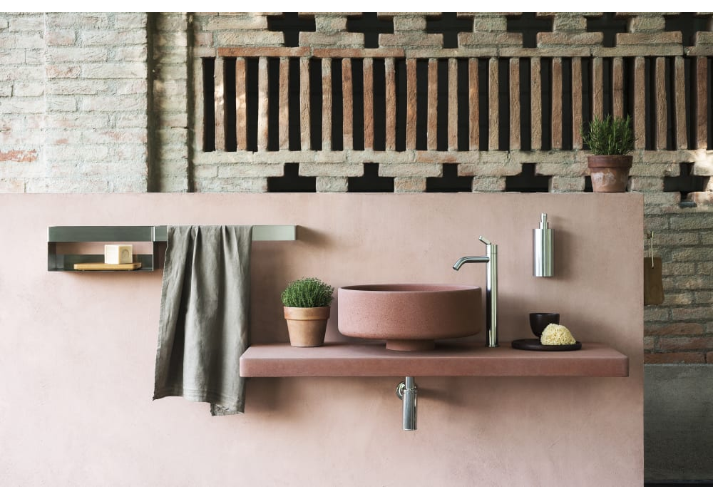 Bjhon 1 Outdoor designed by Angelo Mangiarotti for Agape is a round countertop washbasin made of Petit Granit marble or Cementoskin® in different finishes. It is characterized by a cylindrical basin, without a tap hole, with free drainage. Complete drain with matching cap included.