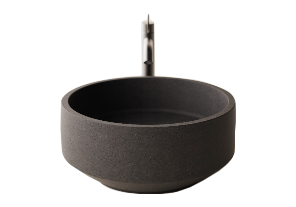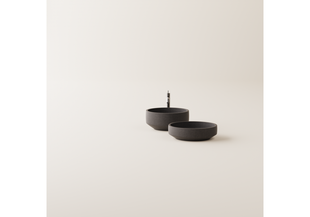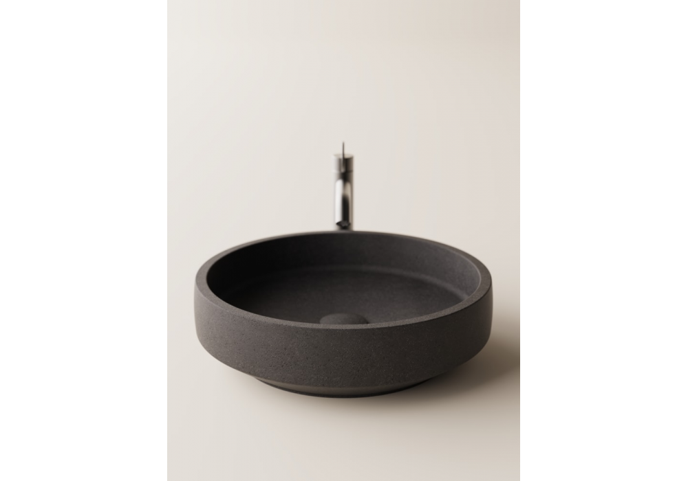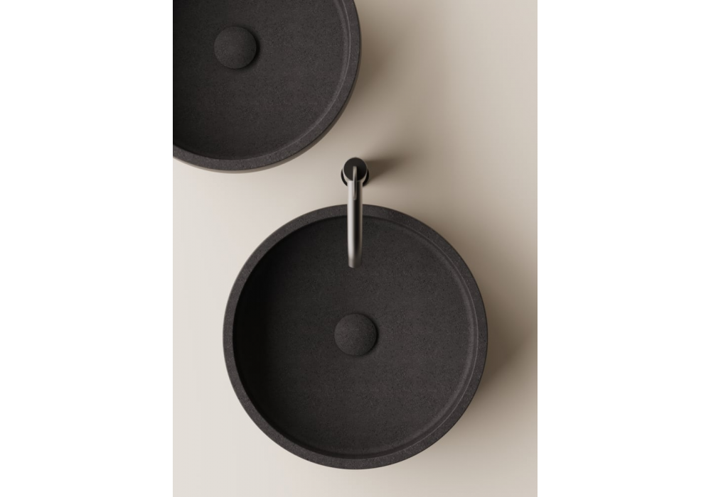 Cenote Lava designed by Patricia Urquiola for Agape is a round countertop washbasin made of reclaimed lava stone or marble in different finishes. Without tap hole, free-flow. Drain complete with matching cap included.