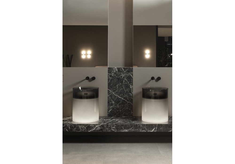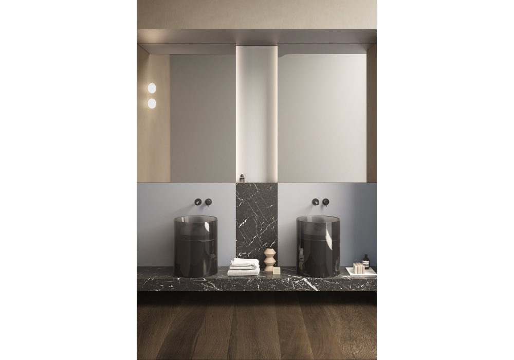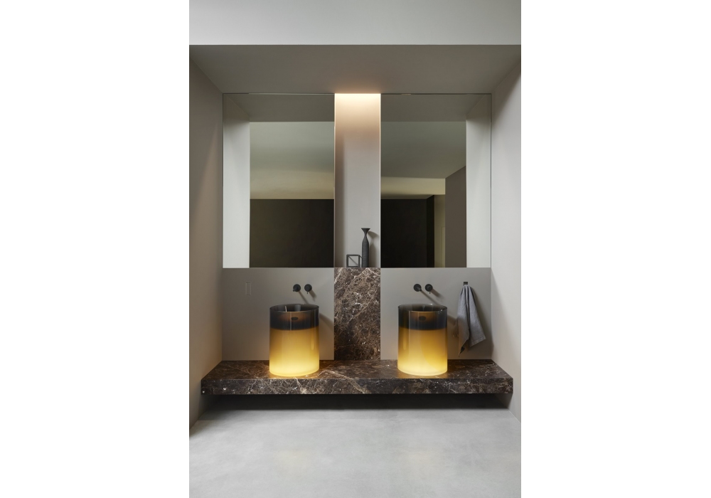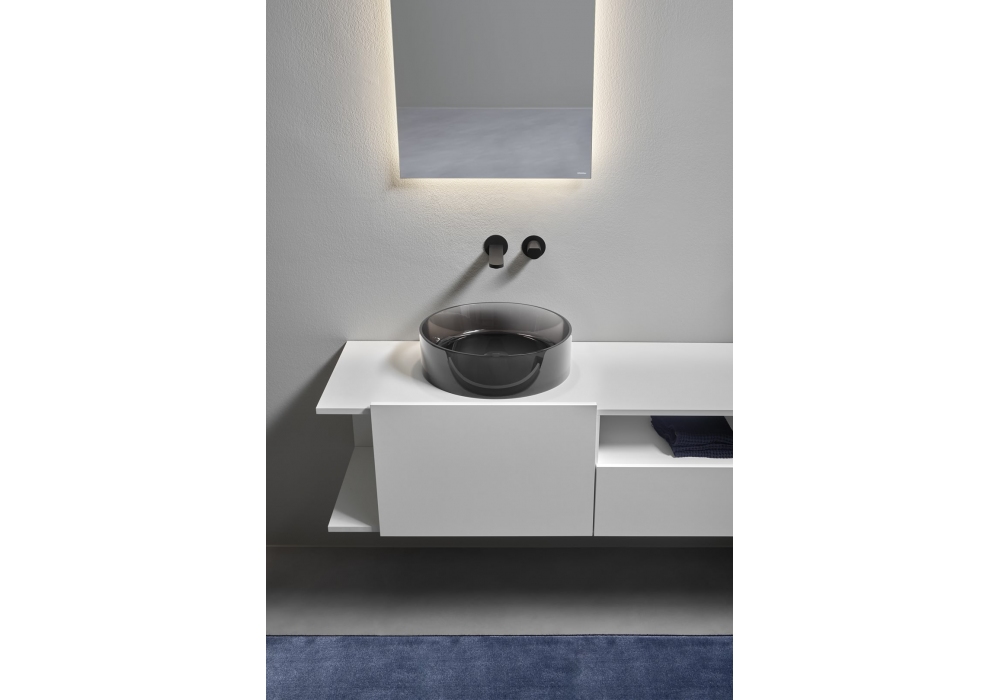 Breeze designed by Antonio Lupi is a countertop washbasin made of Cristalmood or Icemood, complete with a drain with open outlet and siphon connection. Available with or without LED lighting.