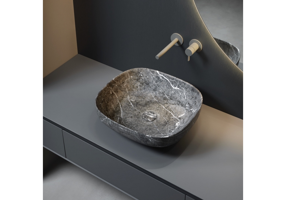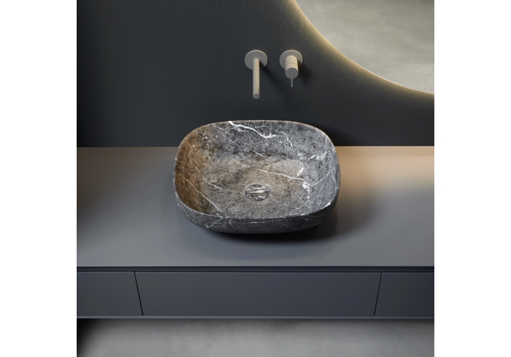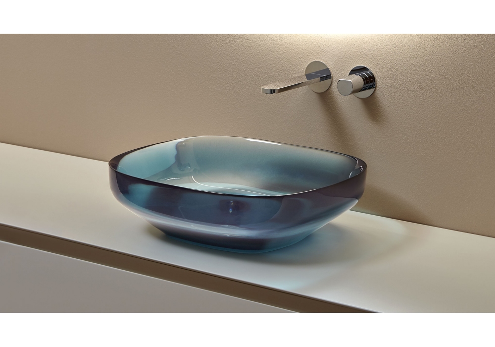 Ago designed by Mario Ferrarini for Antonio Lupi is an oval countertop washbasin in Flumood or Colormood, stone, Cristalmood, or Icemood. It comes complete with a drain with open outlet and siphon connection.