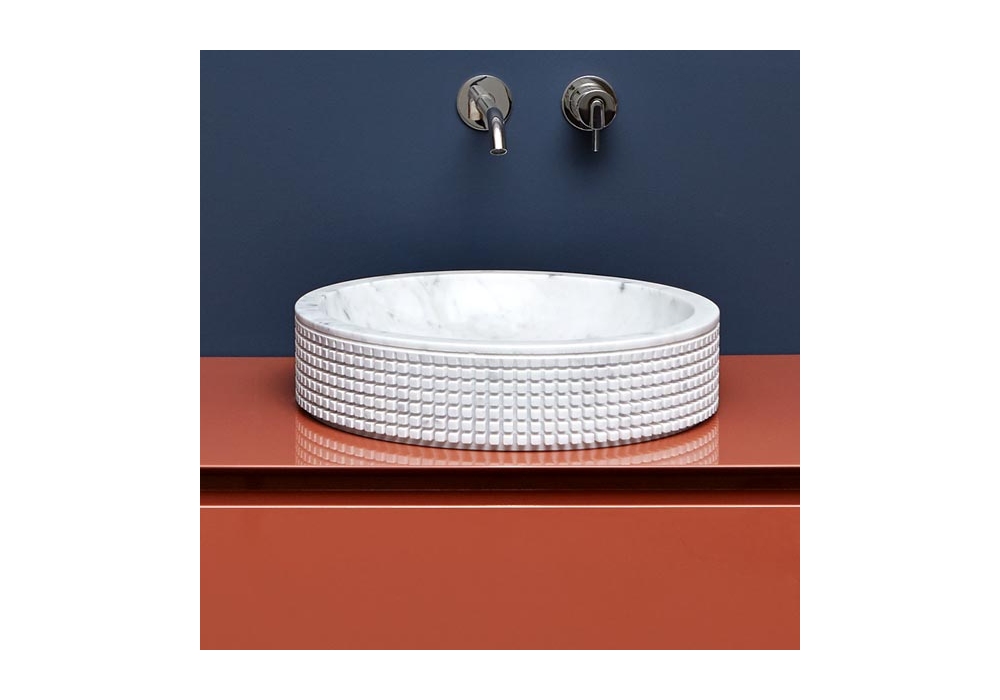 Pixel45 designed by Paolo Ulian for Antonio Lupi is a round countertop stone washbasin, complete with drain with open plug and siphon connection.