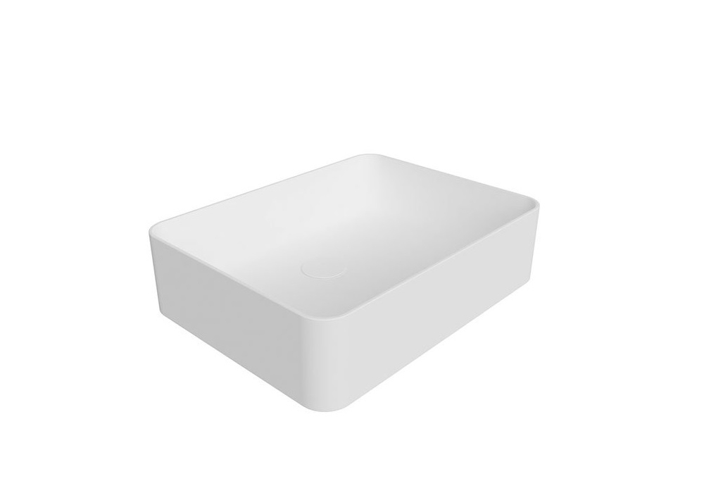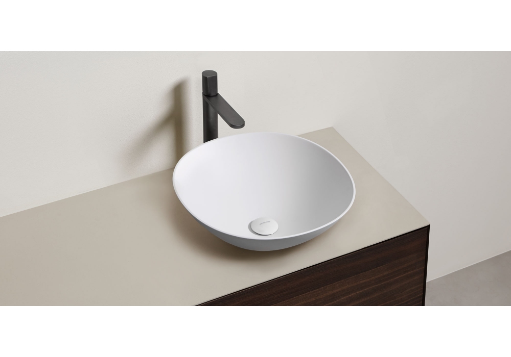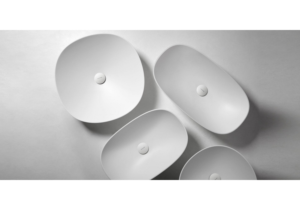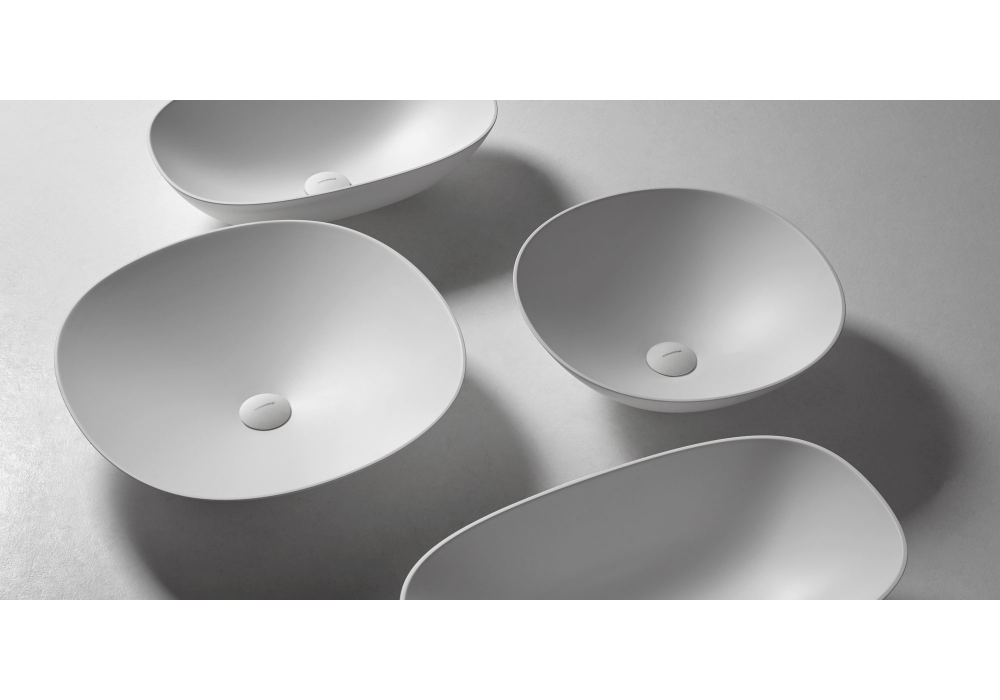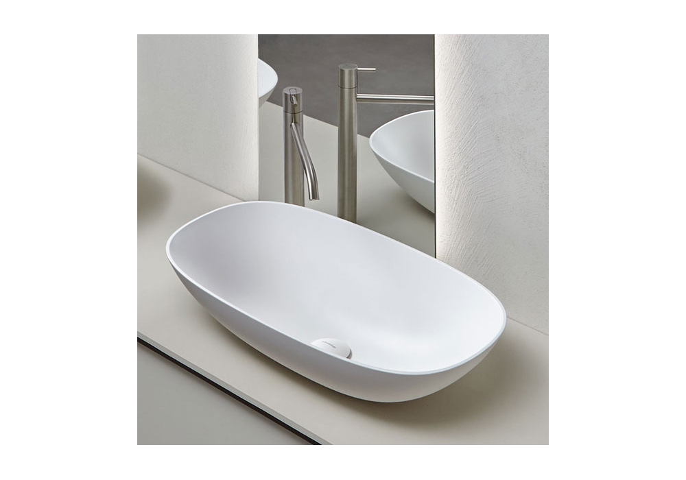 Velo designed by Mario Ferrarini for Antonio Lupi is a countertop washbasin in Flumood or Colormood complete with drain with open drain and siphon connection.