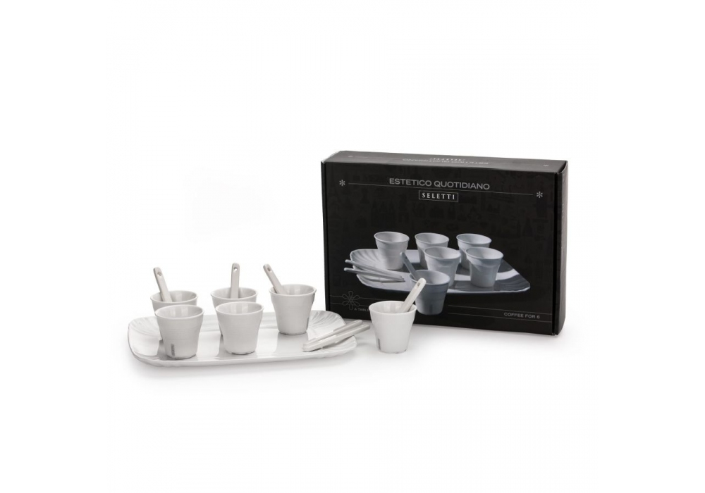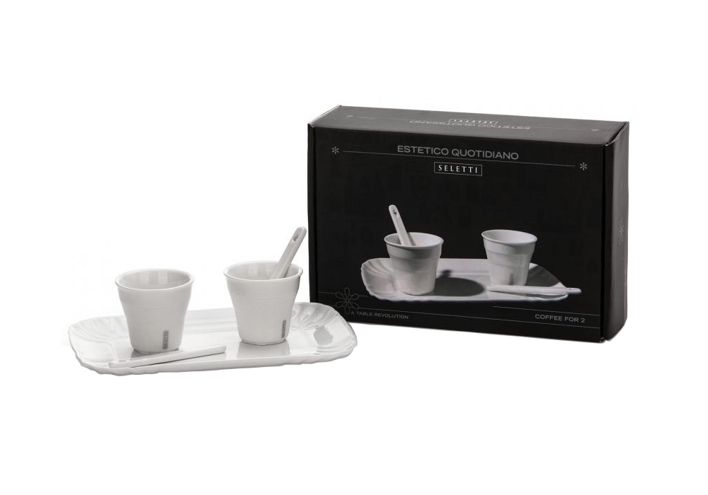 Estetico Quotidiano Coffee designed by Selab & Alessandro Zambelli is a porcelain set consisting of 2 or 6 coffee cups, stirrers and tray. Estetico Quotidiano Coffee is available in two different tray versions with a set of 2 or a set of 6 cups.