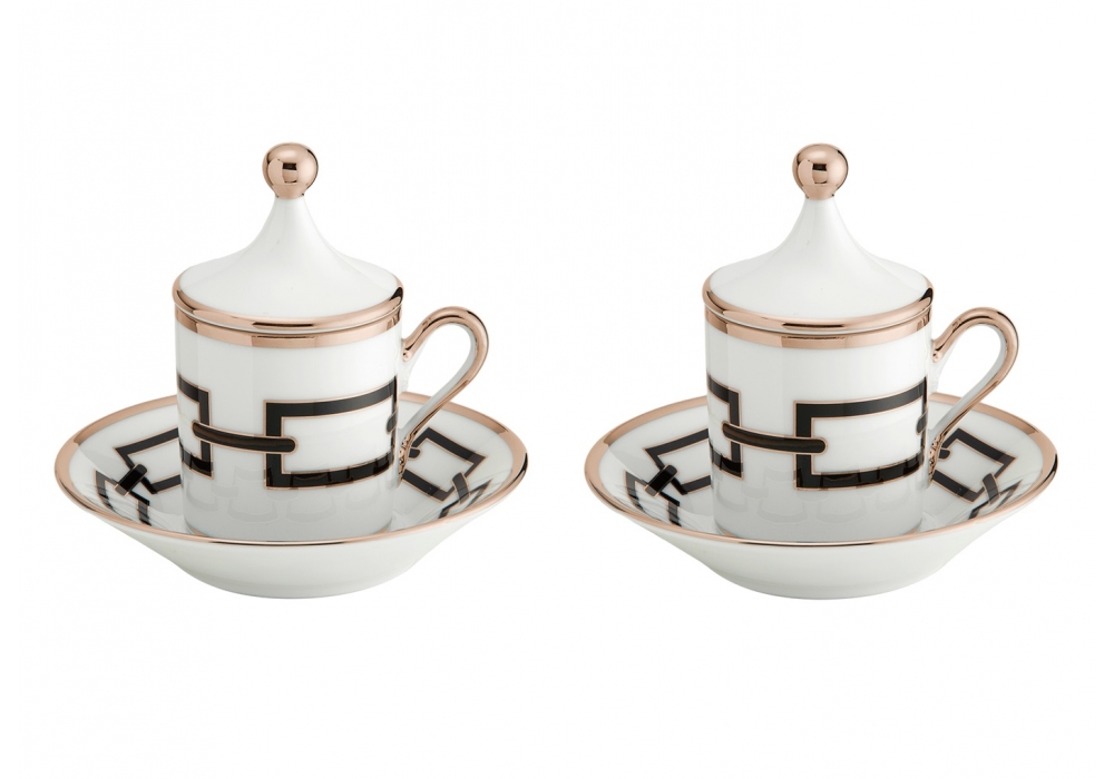 Tazza Caffè con Piatto e Coperchio Catene Nero designed by Ginori 1735 is a set of 2 decorated coffee mug. With saucer and lid.