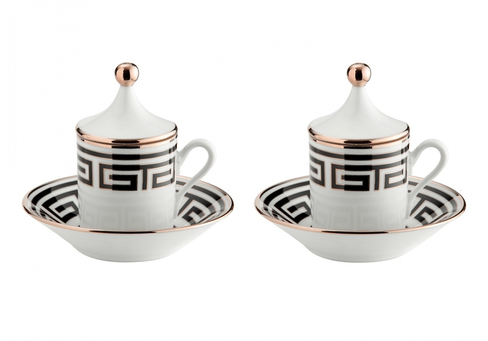 Tazza Caffè con Piatto e Coperchio Labirinto Nero designed by Ginori 1735 is a set of 2 decorated coffee mug. With saucer and lid.