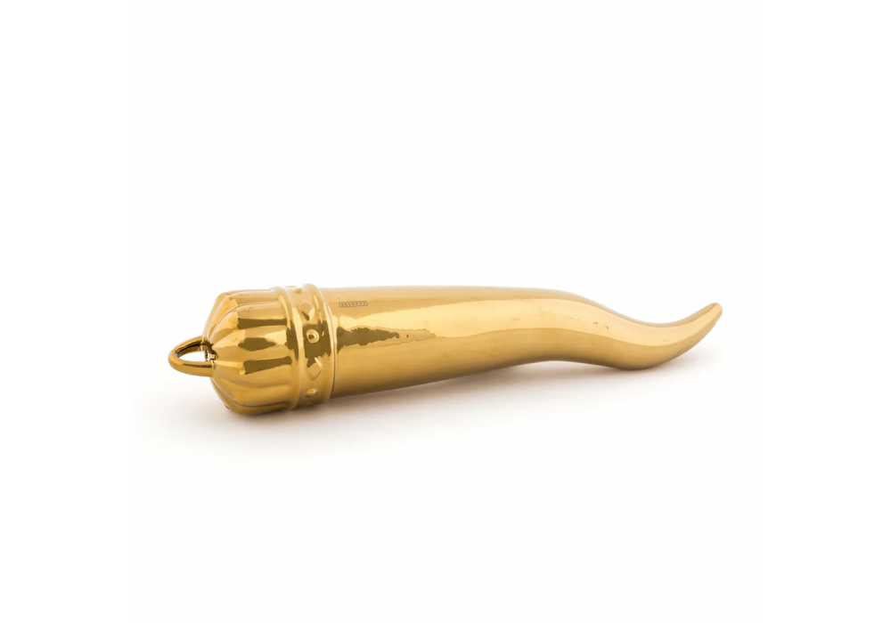Il Cornetto designed by Selab & Alessandro Zambelli for Seletti is a furnishing element entirely made of gold-colored porcelain.