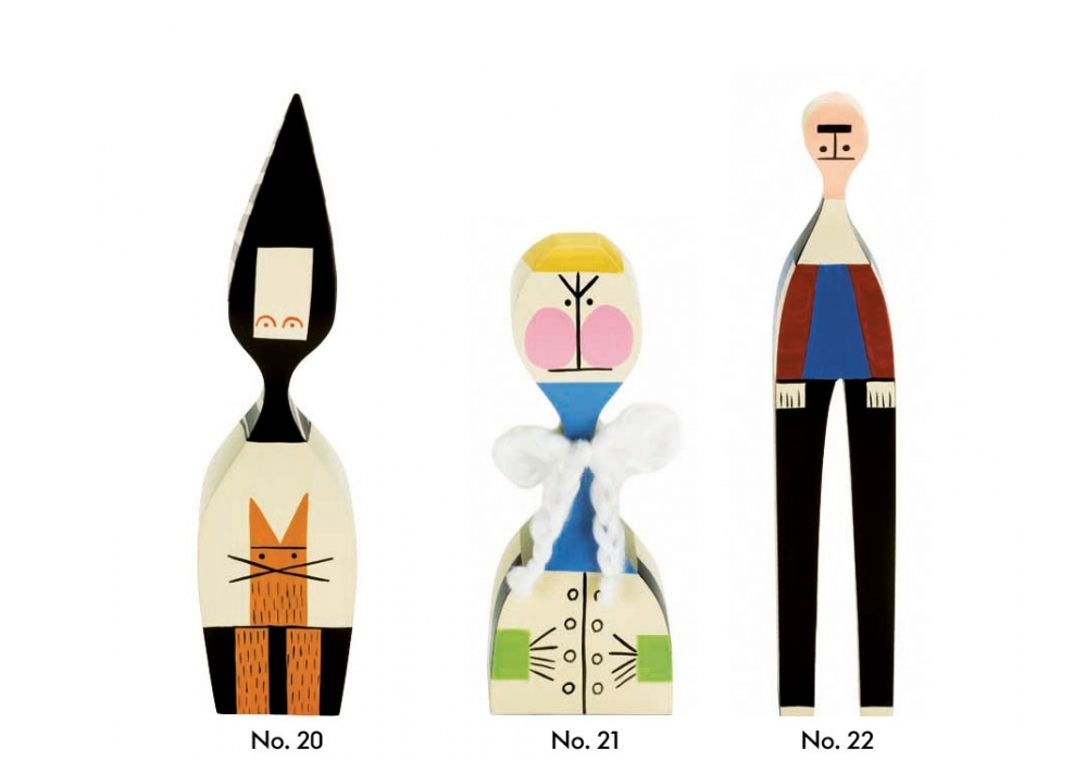 Vitra Wooden Dolls: The Wooden Dolls, which Girard created for his own home in Santa Fe and made himself, are likewise inspired by his own extensive collection of works of popular art. Half decorative element, half toy, the Wooden Dolls were originally intended only for personal use. Based on originals found in the Girard Estate held by the Vitra Design Museum, the partly joyful, partly grim-looking company of dolls is now coming out as a charming enhancement to any interior. Collection Vitra Design Museum. N. 1: 48x37x275 mm N. 2: 78x45x185 mm N. 3: 78x45x146 mm N. 4: 78x45x270 mm N. 5: 48x35x272 mm N. 6: 70x43x177 mm N. 7: 46x36x303 mm N. 8: 70×42×210 mm N. 9: 62×45×205 mm N.10: 74×45×160 mm N.11: 74×45×200 mm N.12: 180×80×45 mm N.13: 175×70×45 mm N.15: 150×70×45 mm N.17: 144×78×46 mm N.18: 153×72×47 mm N.19: 154×77×47 mm N.20: 234×49×43 mm N.21: 182×76×48 mm N.22: 236×45×34 mm