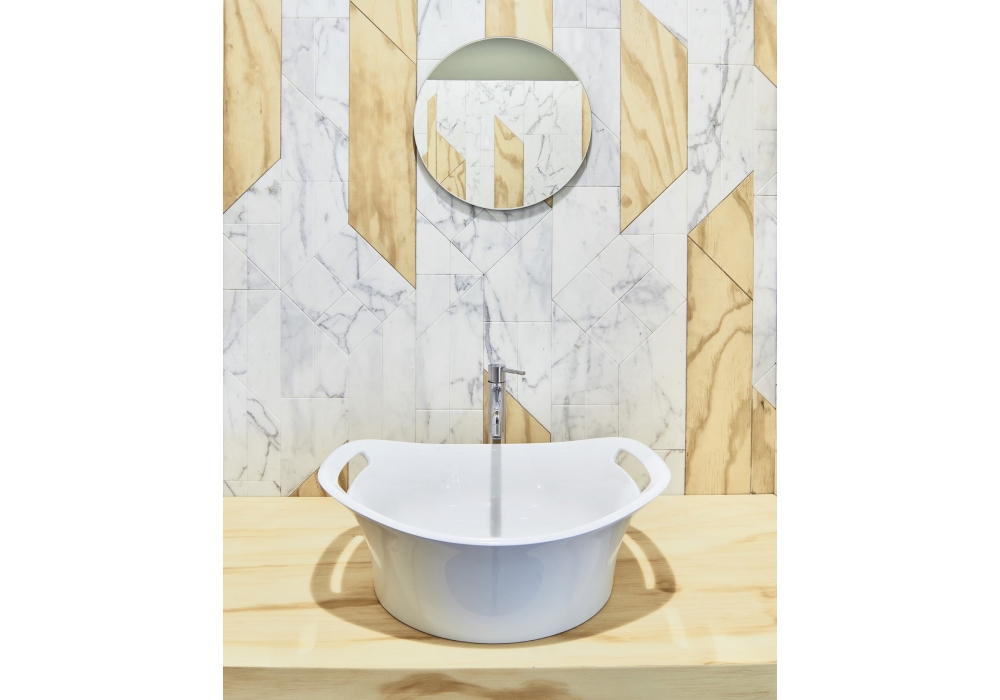 W&W designed by Patricia Urquiola for Budri is a modular decorative wall panel made with Bianco Statuario marble and Chilean wood that enhances the geometric patterns of the wall.
