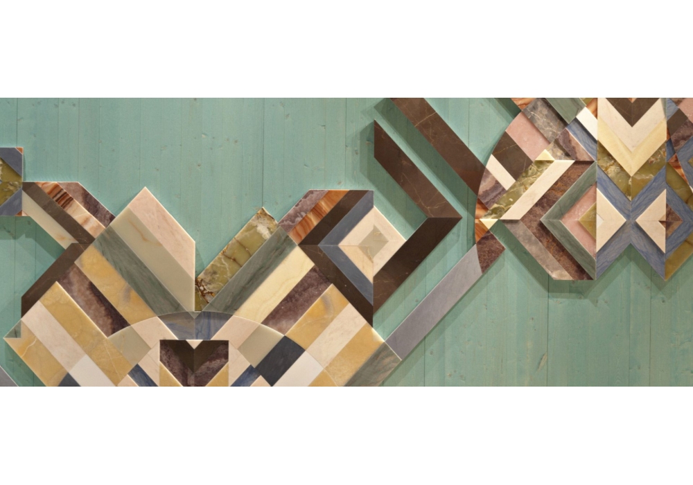 Earthquake designed by Patricia Urquiola for Budri is a decorative floor / wall panel made with fragments of marble and semiprecious stones, coming from the slabs damaged by the earthquake. Precious marbles and onyxes interspersed with mandarin-colored resin geometries form a large decoration with a lenticular effect. Part of the inlay slides to the floor, where Kilim inlays flow into the wood.