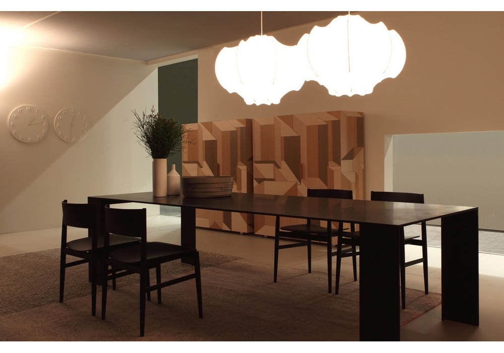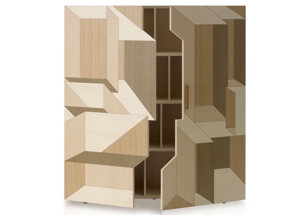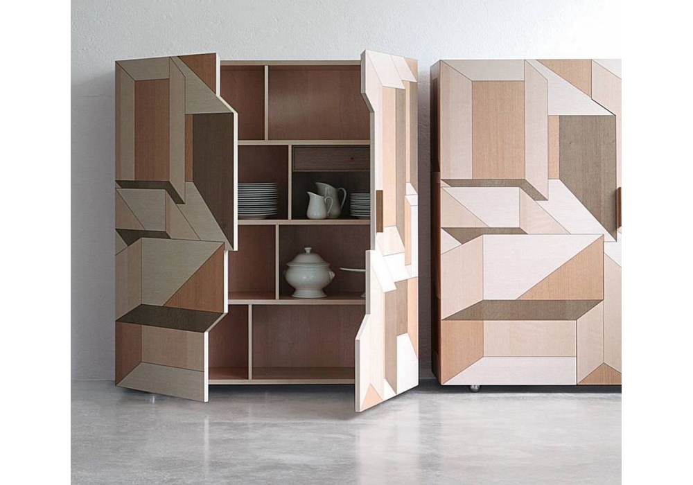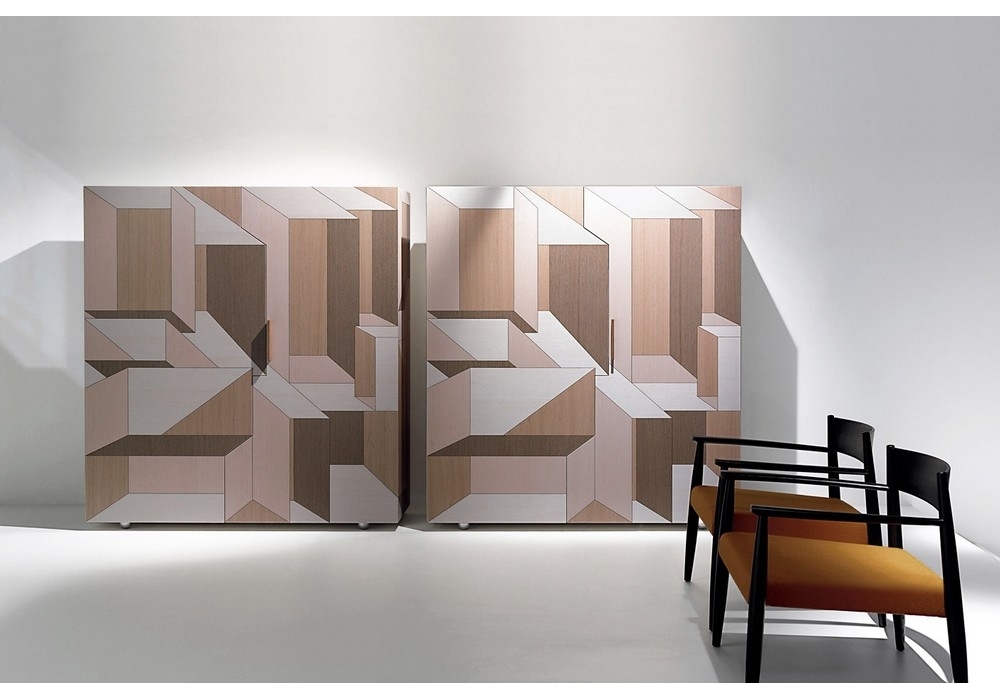 Inlay is a sideboard designed by Front for Porro. Inlay entirely recovers the inlay technique, an ancient and precious old time tradition. A sideboard for the sitting room covered with a decoration recalling parallelepipeds crossed in space, leading to a unique 3 D effect.