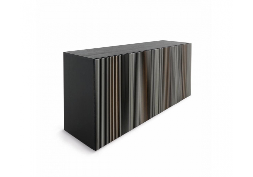 Carlos designed by Renato Zamberlan for Horm is a collection of sideboards with structure in veneered and dyed or lacquered particle board panels. Doors in MDF honeycomb with internal transversal reinforcements in metal, veneered in heat-treated oak and milled vertically to accommodate vertical inserts in full-colour white laminate. Internal shelves in transparent tempered glass.