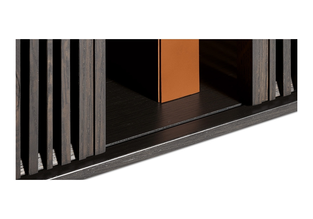 Lloyd designed by Jean-Marie Massaud for Poltrona Frau is a sideboard with variable geometries. A series of thin vertical wooden rods form light grids that run from top to bottom on invisible horizontal guides. Each grid can be moved as desired creating diff erent sequences each time. A fluctuating score of solids and voids, of light and shade.