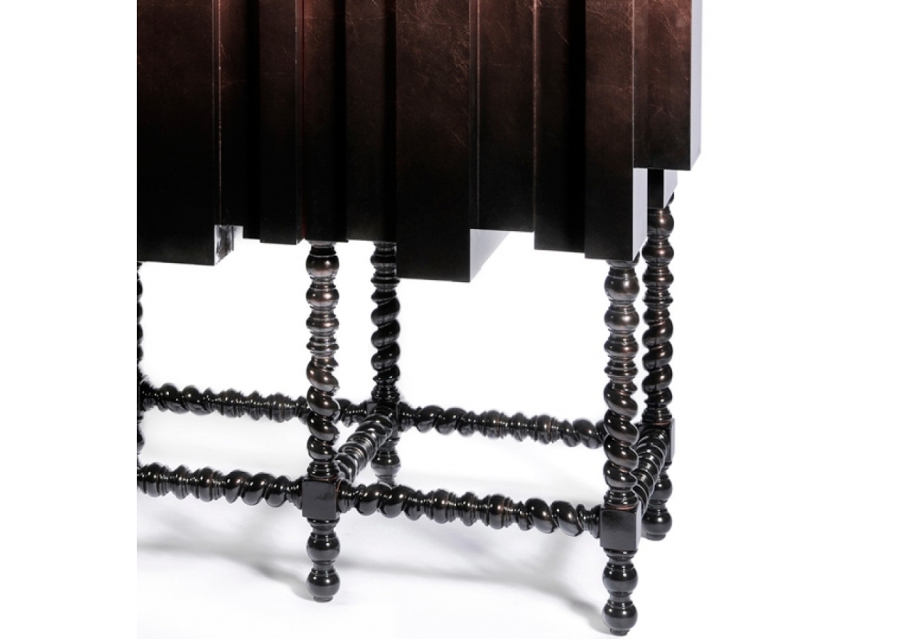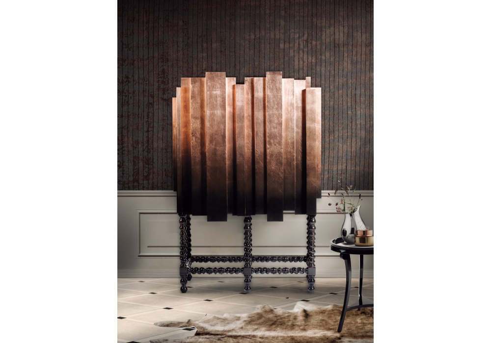 D.Manuel designed by Boca Do Lobo is a beautiful cabinet with wooden structure, covered with a special mesh of stainless steel. The base is carved from mahogany Interior is compartmentalized with angling shelves covered in gold leaf finished with a translucent orange high gloss varnish.