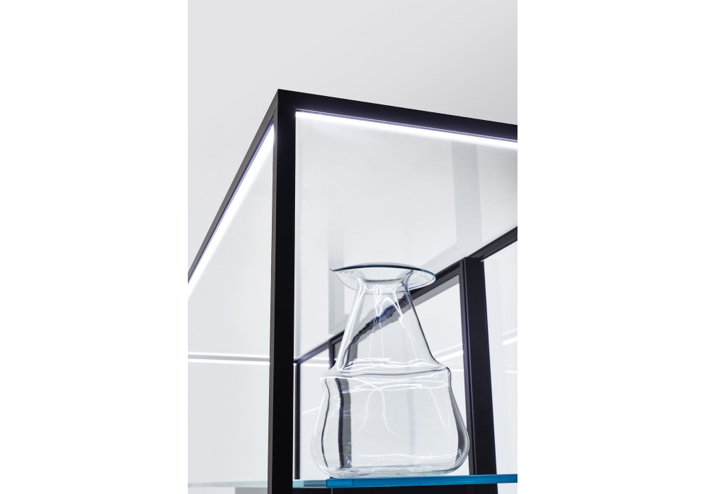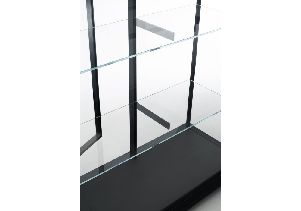 Wunderkammer designed by Piero Lissoni for Glas Italia is a beautiful showcase with a structure in dark brown anodized or opaque white lacquered aluminium, highly finished details and panel systems in tempered transparent extralight glass. The base is covered with opaque lacquered glass. The shelves are supported by adjustable brackets fixed to two vertical pillars that are used as a striker for the door, which is supplied with fully adjustable hinges. These products, provided on demand with lock and completely disassembled, are perfect for museums and shop display uses. The transparent extralight glass and the thinness of the structure allow a perfect 360-degree visibility of the objects within.