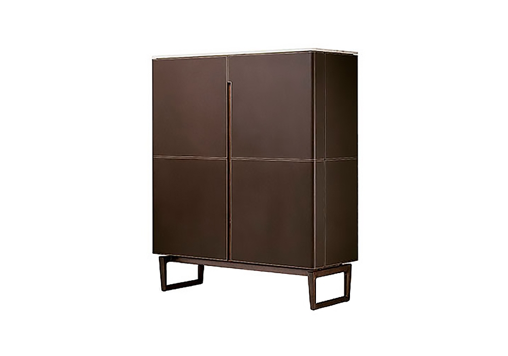 Fidelio designed by Roberto Lazzeroni for Poltrona Frau is a high cabinet with structure in solid ash wood and birch plywood veneered in ash with a moka finish, on the external side, and in natural extra light maple on the inner side. Top available in ash or marble. Basement in moka-stained ash. Covering in Saddle or Saddle extra leather.