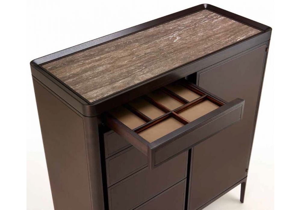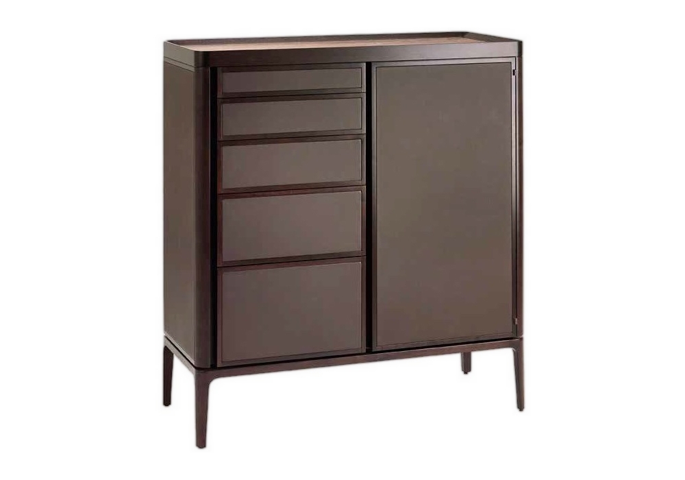 Full designed by Roberto Lazzeroni for Ceccotti Collezioni is a cabinet with structure and base in solid american walnut made. Doors, drawers and sides covered in wood ebony makassar or upholstered in fabric or leather. Also available in different types.