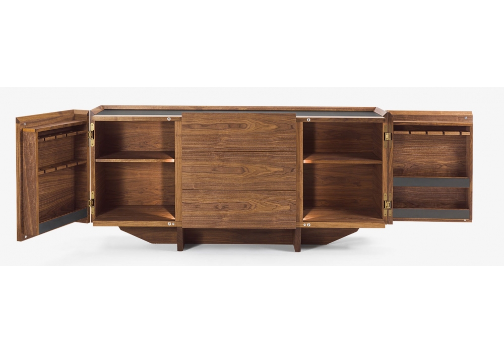 Pandora designed by Gabriele & Giuliano Cappelletti for Riva 1920 is a multifunctional sideboard in blockboard wood, also available in the version with metal or leather insert on the top and on the shelves inside the doors. Side containment doors, with 180 ° opening angle, equipped with small shelves to contain or hang glasses. The two side compartments are illuminated by means of LED strips positioned on the central shoulders, whose ignition is automatic by means of sensors that are activated when the doors are opened.
