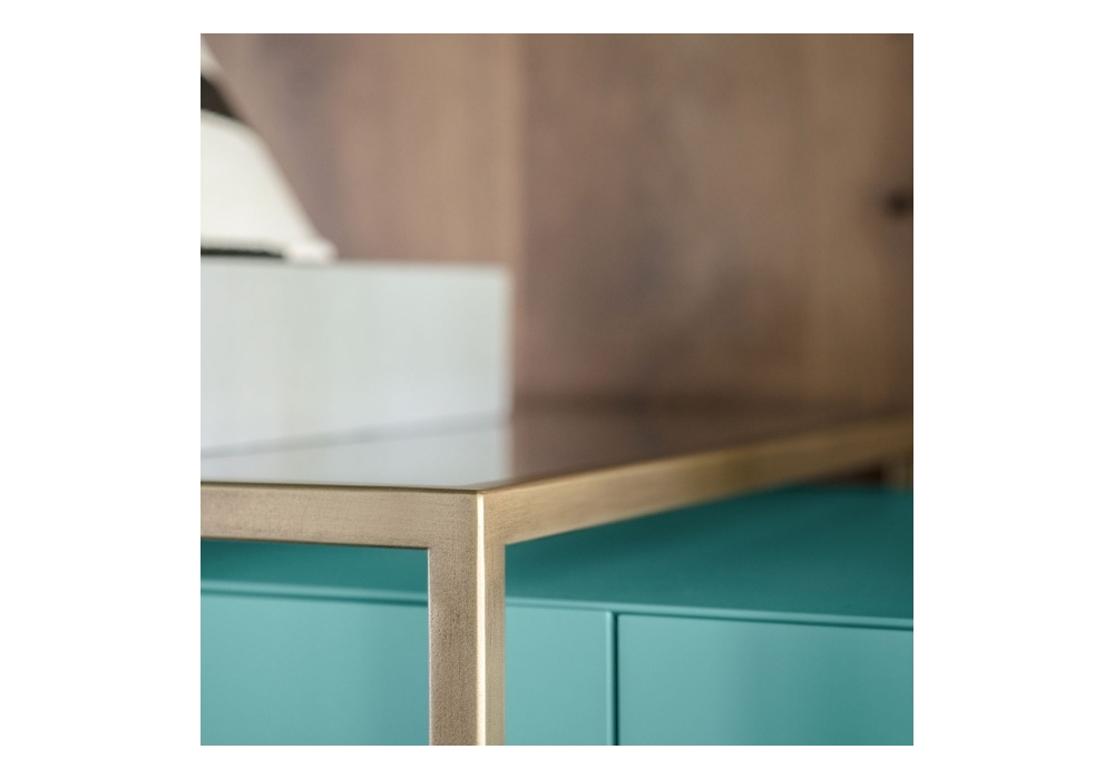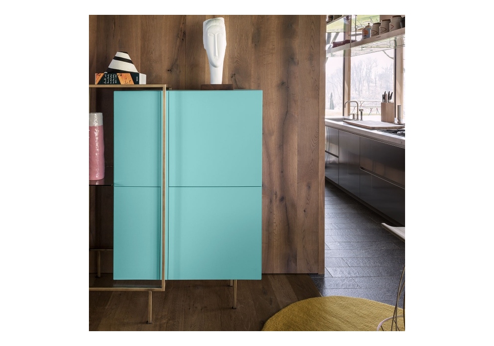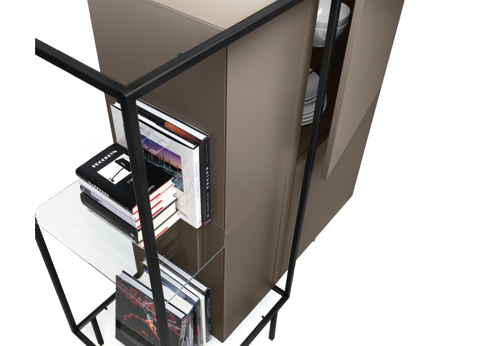 Zoom designed by Uto Balmoral for Mogg is a cabinet with a metal frame, complete with glass shelves. The MDF structure is applied with an embossed lacquer in different colors or plated in mahogany feather. The metal frame is painted matt black or patinated bronze.