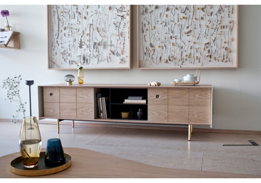 Mitch designed by Luca Nichetto for De La Espada is a wooden sideboard with sliding doors, vertical panels made of HDF and brushed brass feet.