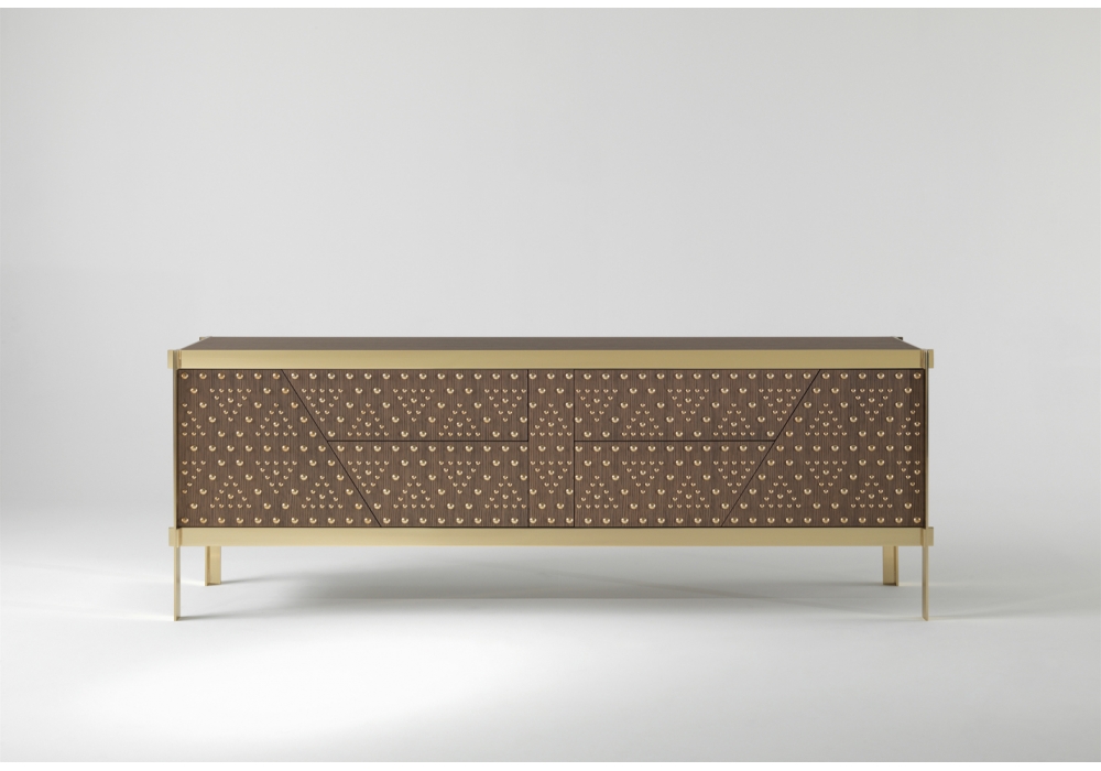Dolly designed by Ferruccio Laviani for Emmemobili is a sideboard made of veneered panels with brass structure. The façade and the sides are decorated with brass turned studs, with different diameters. Available in 2 types: with doors or with doors and drawers. Inner spaces equipped with a wooden shelf each.