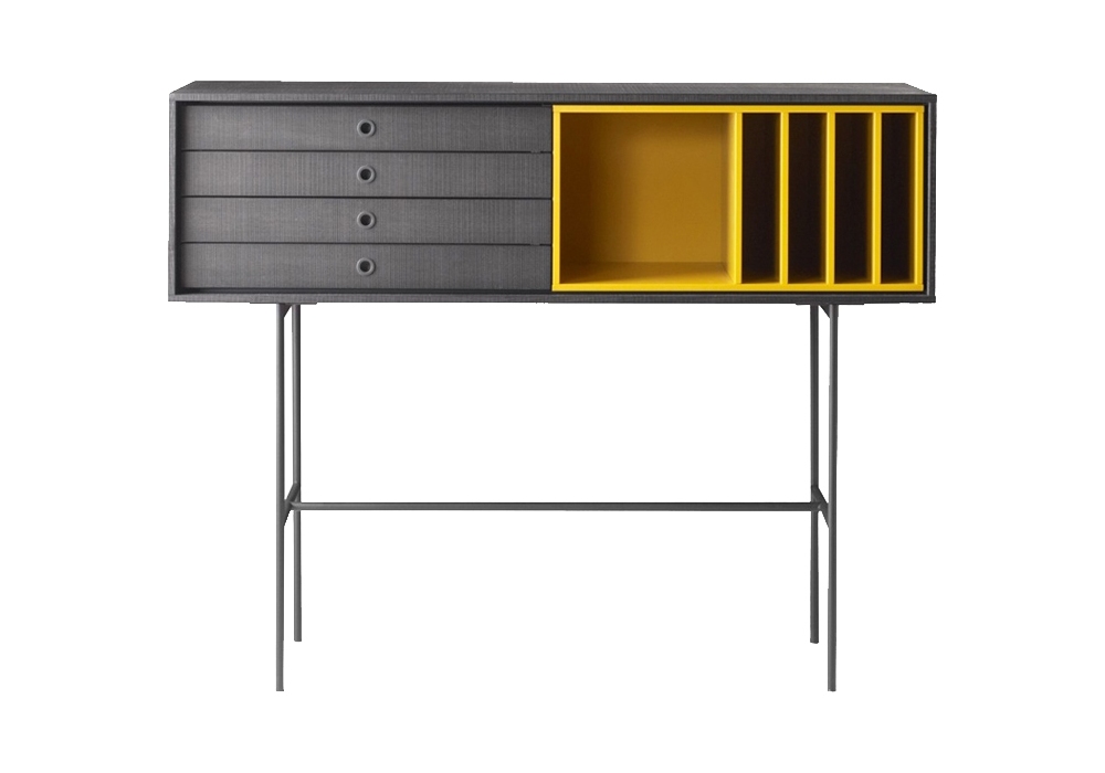Aura designed by Angel Martí and Enrique Delamo for Treku is a high sideboard of the Aura collection. The composition has a high structure on metal legs with a wooden structure, four drawers and an open module.
