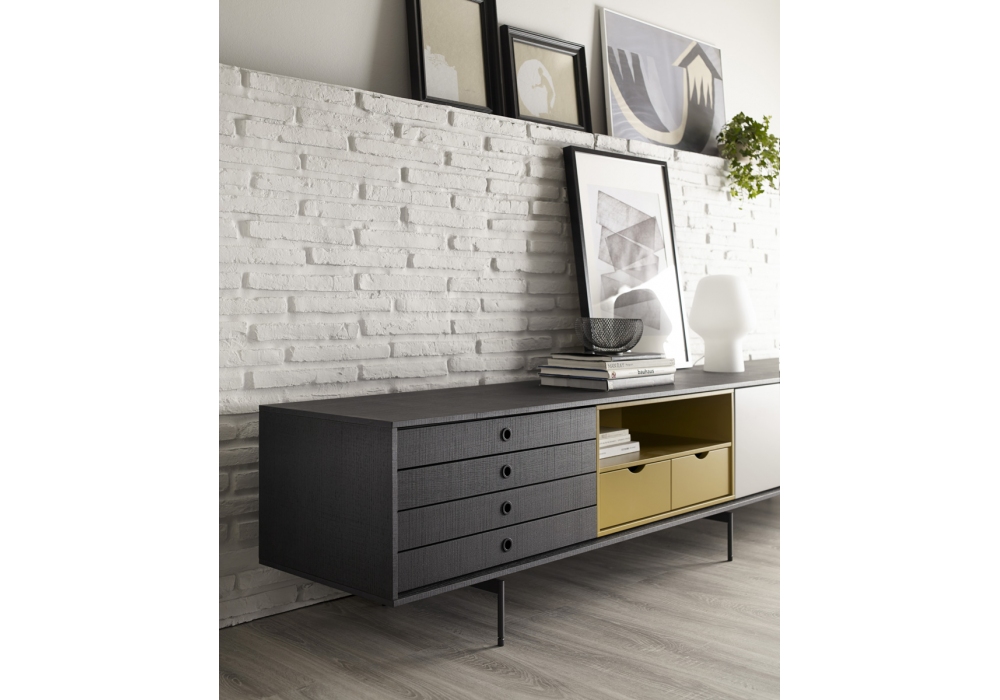 Aura designed by Angel Martà and Enrique Delamo for Treku is a low sideboard from the Aura collection. The composition has a wooden structure on metal legs, two lacquered finish doors, an open compartment with drawers and a module with four drawers in wood finish.