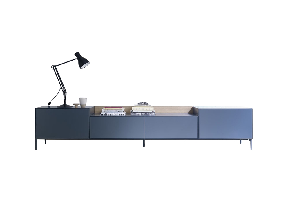 Lauki designed by Ibon Arrizabalaga for Treku is a sideboard from the Lauki collection. The composition has a structure resting on legs with a lacquered finish, four modules with a door in lacquered finish and the upper part of the wooden container in a natural oak finish.