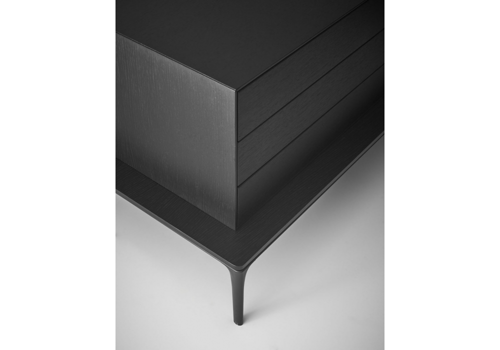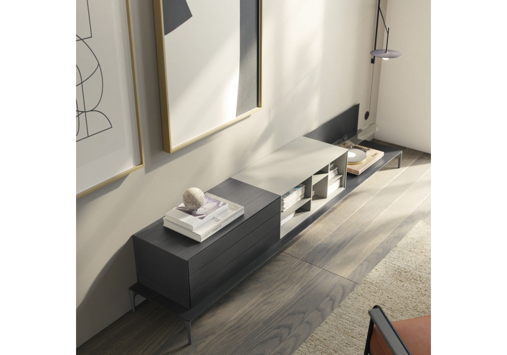 Lauki designed by Ibon Arrizabalaga for Treku is a sideboard from the Lauki collection. The composition has a composition on legs in lacquered metal, a structure with shelf, back and modules with drawers in wood finish. While the lacquered open compartment. Customizable in different finishes and sizes.