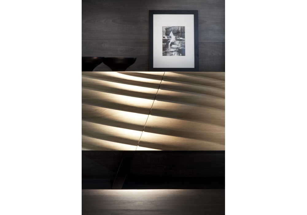 Small Move Wood designed by Mac Stopa for Tonon is a sideboard with structure in veneered wood (oak, canaletto walnut and lacquered) and front surface in three-dimensional mdf veneered in oak or canaletto walnut. Legs in black or white lacquered solid beech.