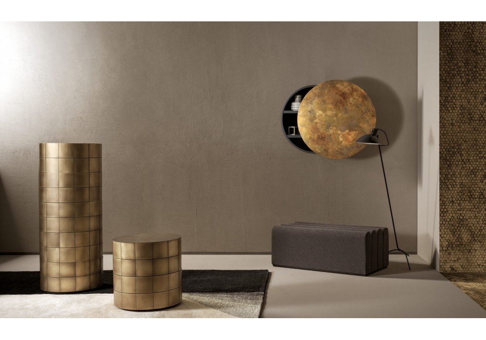 Pandora designed by Martinelli Venezia for DeCastelli is a circular chest of drawers covered in metal, invisible drawers with internal structure in natural oak with push-pull opening. Available in different finishes and dimensions.