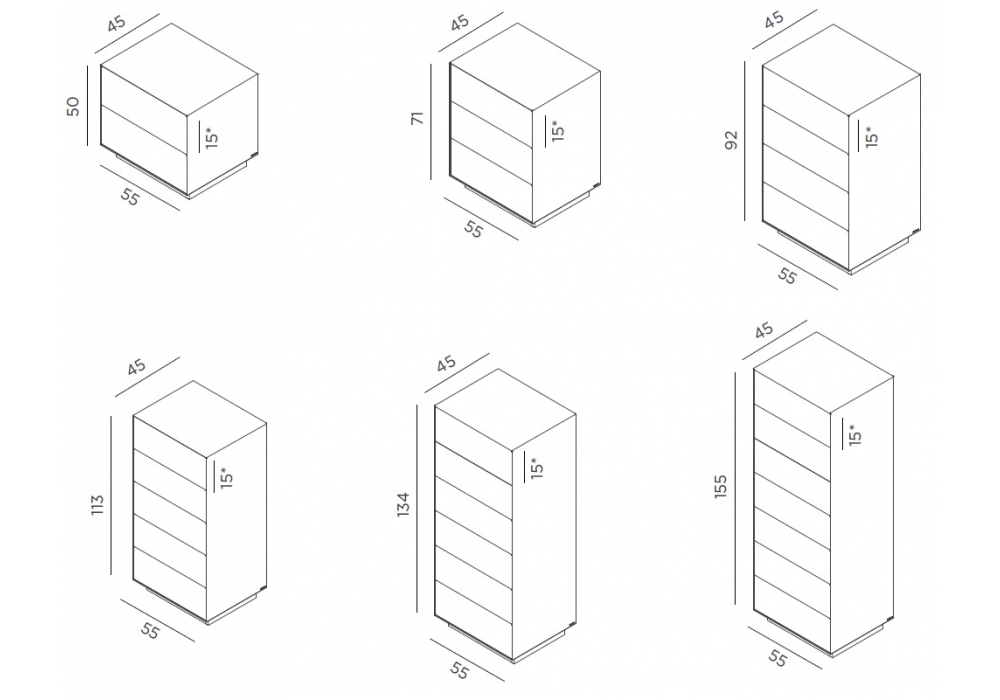 | Dimensions | • 55 x 45 x H 50 cm; • 55 x 45 x H 71 cm; • 55 x 45 x H 92 cm; • 55 x 45 x H 113 cm; • 55 x 45 x H 134 cm; • 55 x 45 x H 155 cm; • 96 x 45 x H 71 cm; • 190 x 45 x H 71 cm; • 285 x 45 x H 71 cm |
