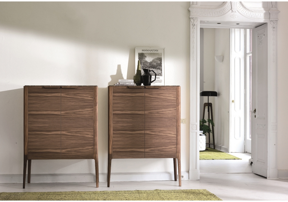 Atlante 1-2 designed by Carlo Ballabio for Porada is a sideboard in canaletta walnut, ash or lacquered with two doors in smoked glass or in wood and top in marble, wood or back-painted acid-etched glass. Internal glass shelves. Available in different finishes.