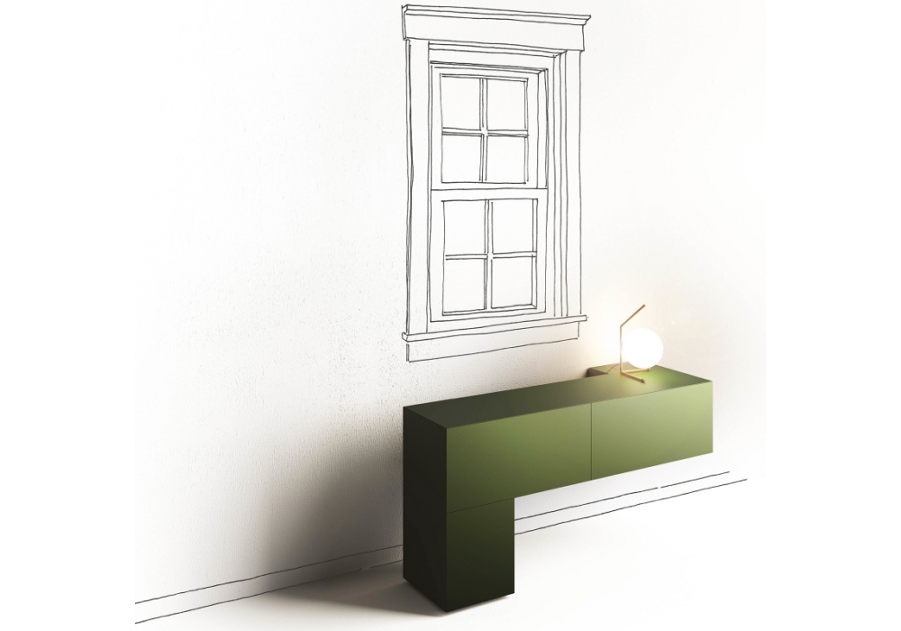 Formosa Adagiata designed by DSH for Minotti Italia is a wooden sideboard consisting of one hinged door and two flap doors, adjustable feet in black abs. Structure available in different finishes and also in gold or silver leaf colour. Lower hinged door opening available from right or left.
