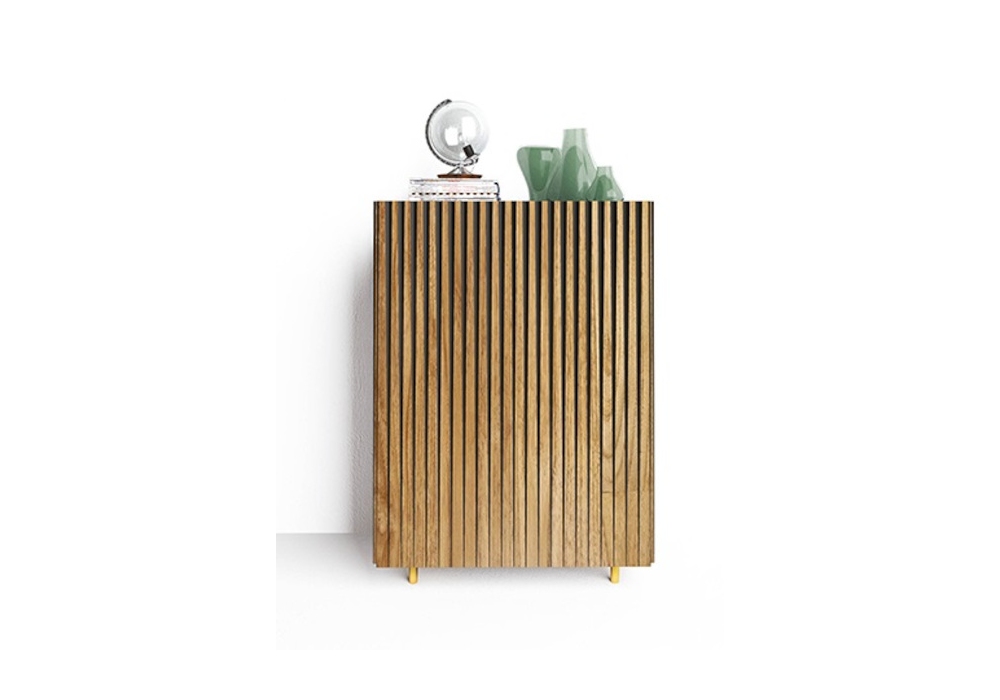 Dorotea Alta designed by Claudio Lovadina for Minotti Italia is a sideboard in black agglomerate wood worked in triangular sections with three-dimensional effect, surfaces in teak wood, transparent matt finish. Support available in different versions: with black base (height 3 cm) or with feet in brass or nickel color (height 10 cm).