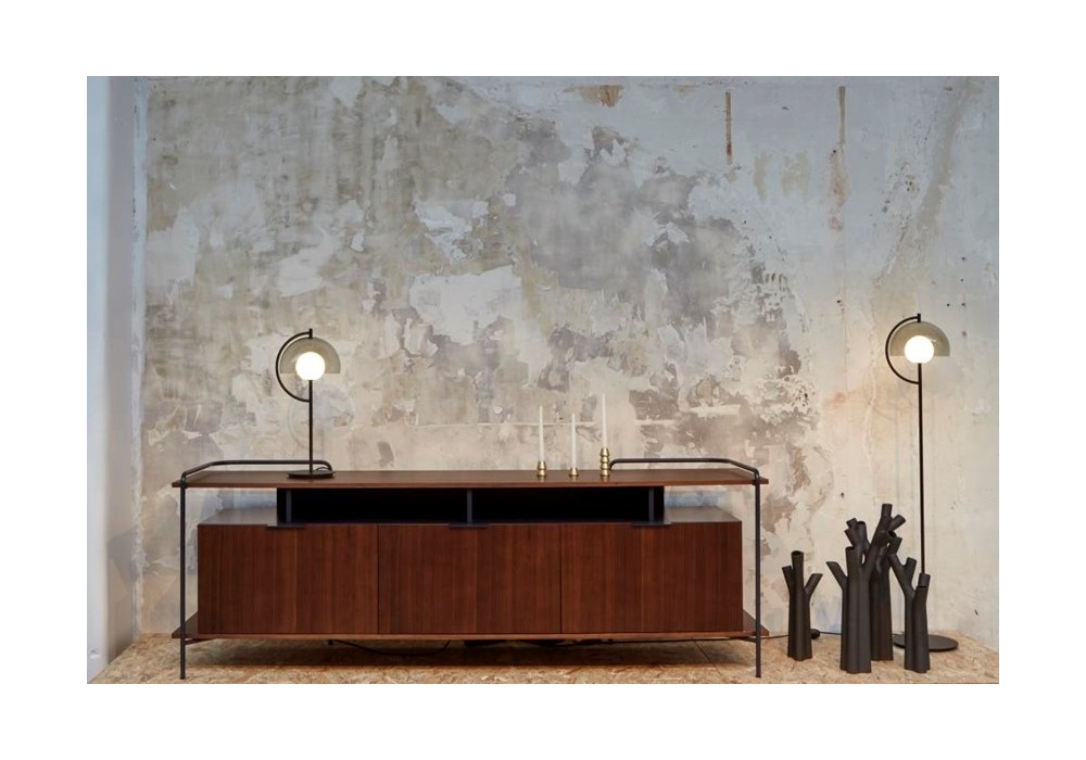 Alando designed by Eric Jourdan for Ligne Roset is a sideboard from the subtle dynamism deriving from the contrast between the metal tubular structure and the dark walnut of the top. Available in different types.