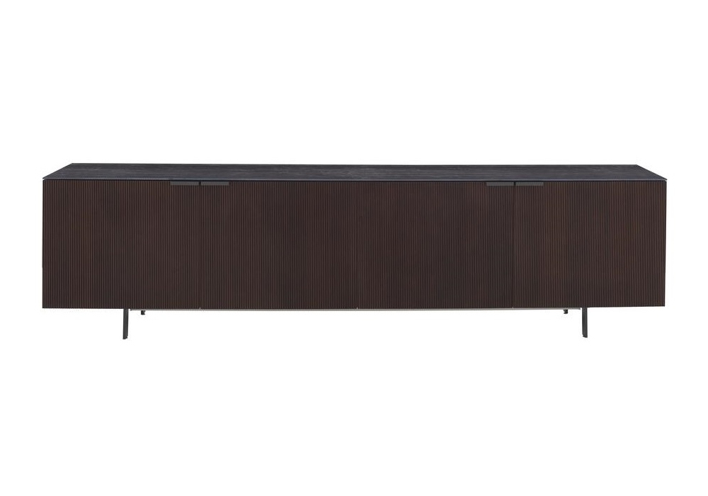 Selvans designed by Christian Werner for Ligne Roset is a sideboard with internal compartments, handles and base finished in Chocolat lacquer. Fronts and sides in grooved wood. Top in ceramic stoneware. Available in different types.
