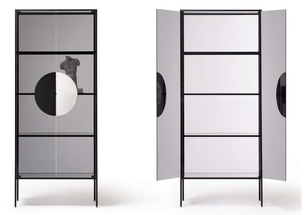 Yang designed by Marta Giardini for Opinion Ciatti is a showcase in tempered glass with decorative handle. Available in two finishes: structure with matt black finish, handle in black nickel finish and smoked glass; structure with burnished brass finish, handle in 24 K gold finish and transparent glass.