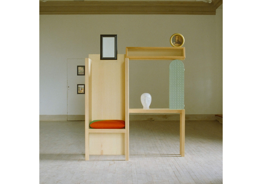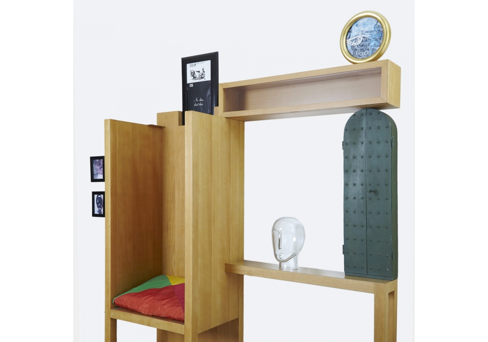 Solus designed by Mimmo Paladino for Memphis Milano is a piece of furniture in wood, with ebony frames and frame covered in gold leaf, silk feather cushion, bronze casket, Venetian glass head. Limited edition of 25 pieces.