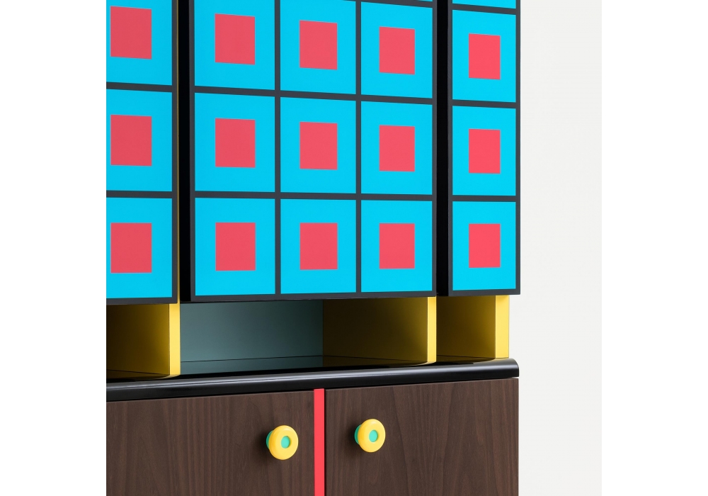 Margherita designed by George J. Sowden for Memphis Milano is a sideboard made of veneered wood and lacquered wood, upper doors in silk-screened wood, feet and back in plastic laminate. Limited edition of 25 pieces.