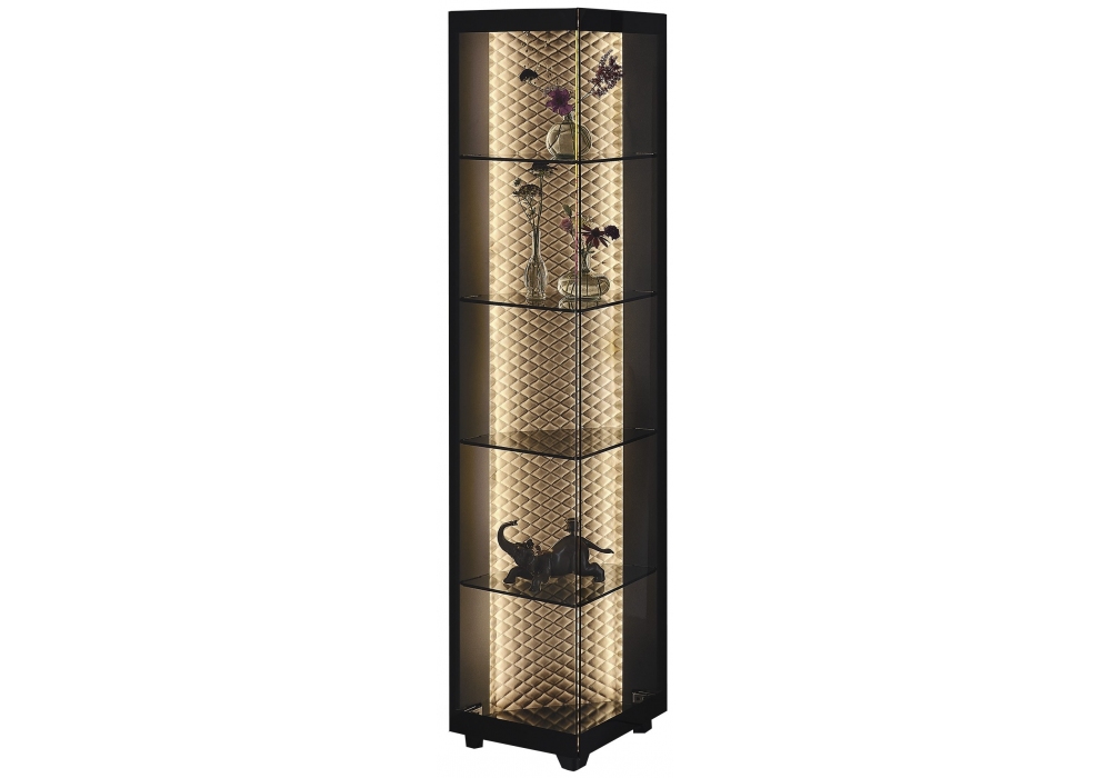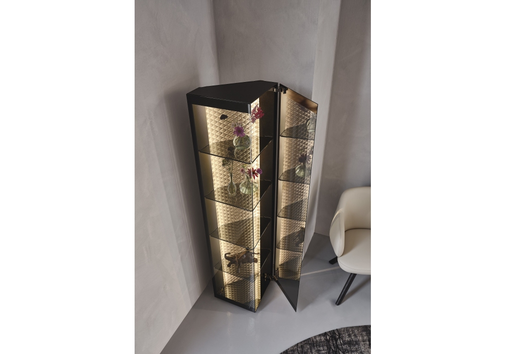 Atelier designed by Alberto Danese for Cattelan Italia is a showcase with LED lighting. Strcuture and feet in black embossed lacquered steel, doors and sides in fumé glass with stripes in black painted glass. Top and bottom in black painted frosted glass, internal back covered and quilted in soft leather or synthetic leather.