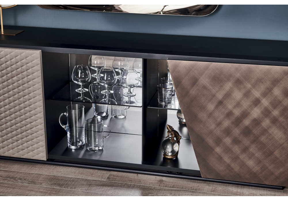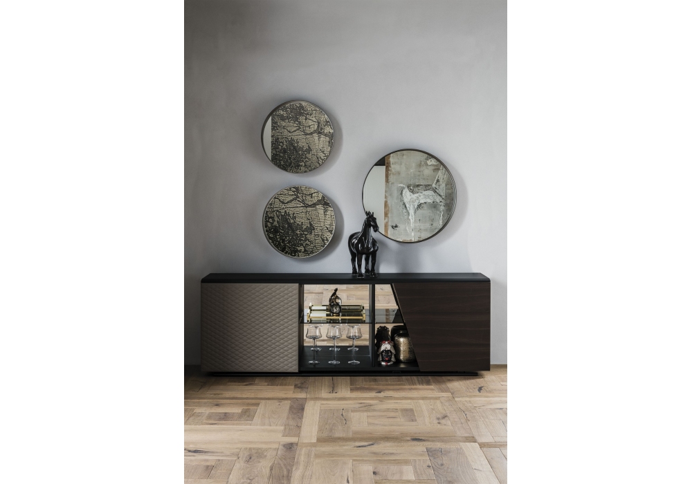 Aston designed by STC Studio for Cattelan Italia is a sideboard with embossed lacquered wood structure and steel base. Left door with quilted covering in leather or eco-leather, central unit with mirror, right door in wood with details in black chrome. Internal shelves in smoked glass.