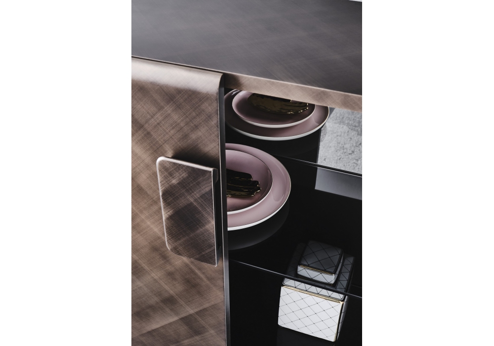 Tudor designed by Paolo Cattelan for Cattelan Italia is a sideboard made of wooden structure in several finishes and doors in brushed Bronze or Brushed Grey. Feet in embossed varnished steel. Shelves in smoked glass and partially mirrored inside.