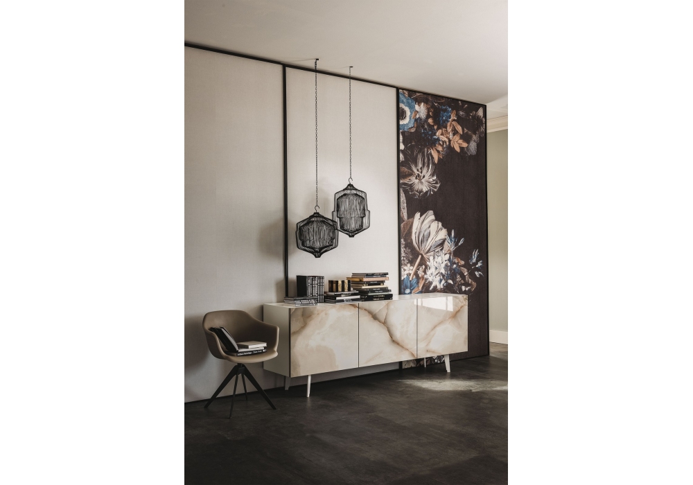 Metropol designed by Paolo Cattelan for Cattelan Italia is a sideboard made of lacquered wooden structure and base in varnished steel in the same colour of the structure. Doors in ceramic Marmi in several colours. Internal shelves in transparent glass. Available with top in extra clear frosted glass painted white, graphite or black or bronze mirrored glass.