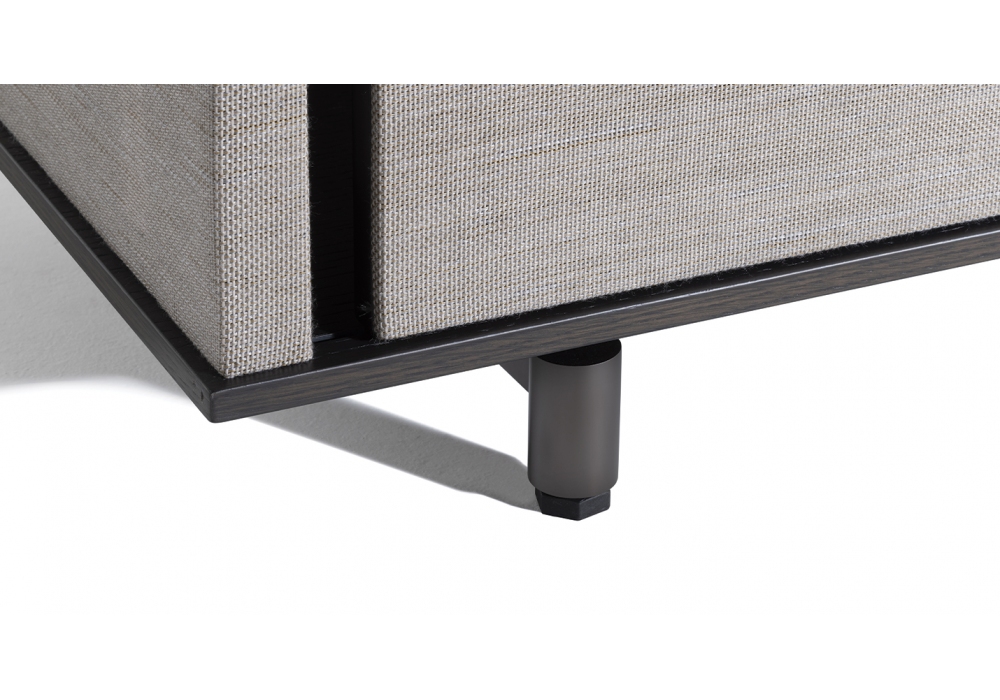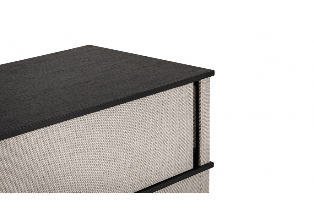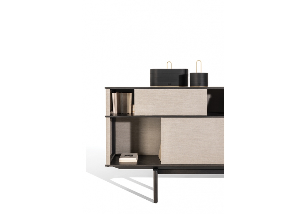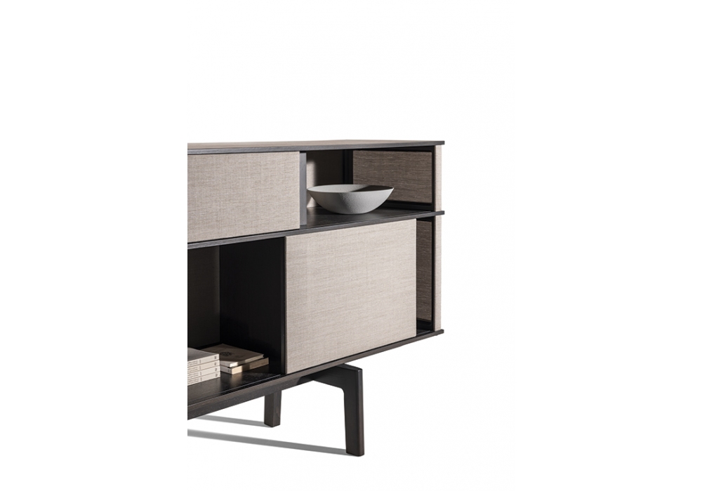Lloyd Tex designed by Jean-Marie Massaud for Poltrona Frau is a sideboard composed of vertical uprights made of MDF natural oak veneer. The sides are closed by fixed panels made with a birch plywood frame that are covered in technical fabric. Shelves made of high-pressure laminate in a natural oak veneer. Movable panels that slide along tracks carved into the shelves and plastic “skates” that reduce friction between the surfaces. They are made with a birch plywood frame covered in technical fabric.