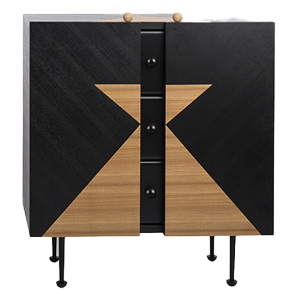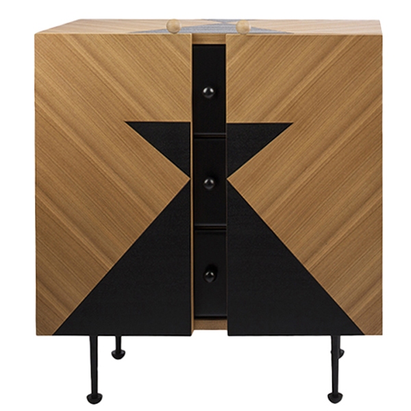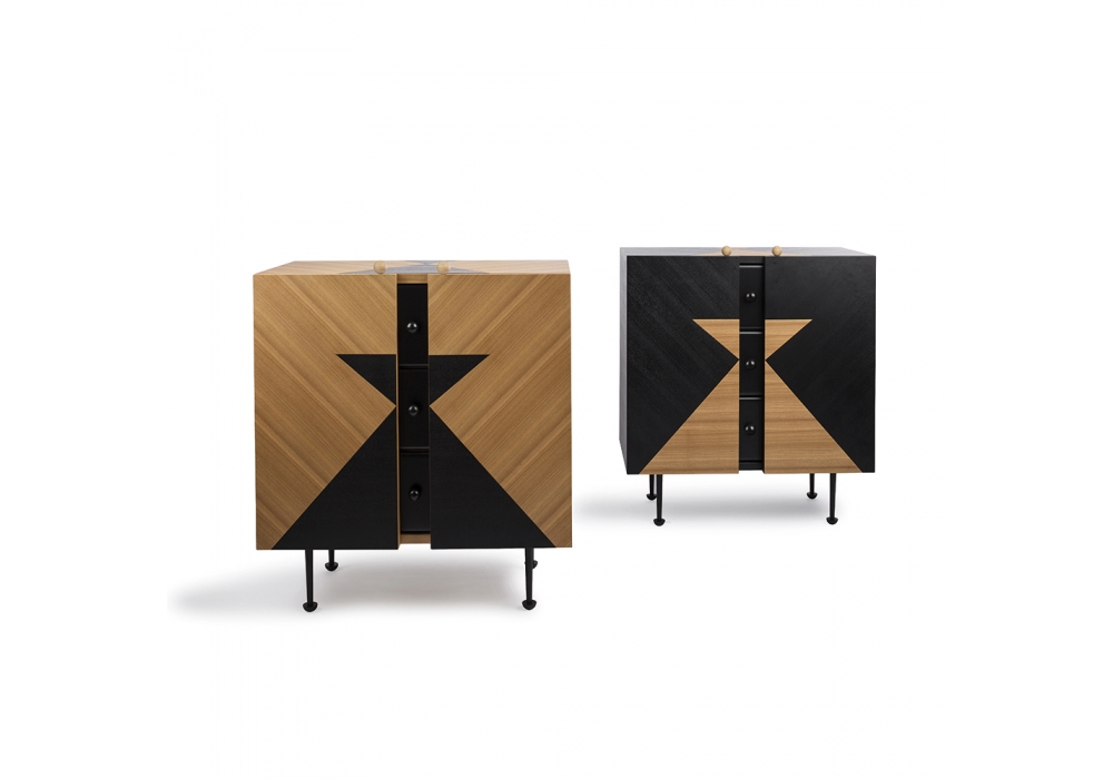 Yin & Yang designed by Thomas Dariel for Maison Dada is a quadrangular shaped chest of drawers in MDF veneered with natural ash with black lacquered parts. The legs are in black powder coated metal. Yin & Yang are available in two different models.
