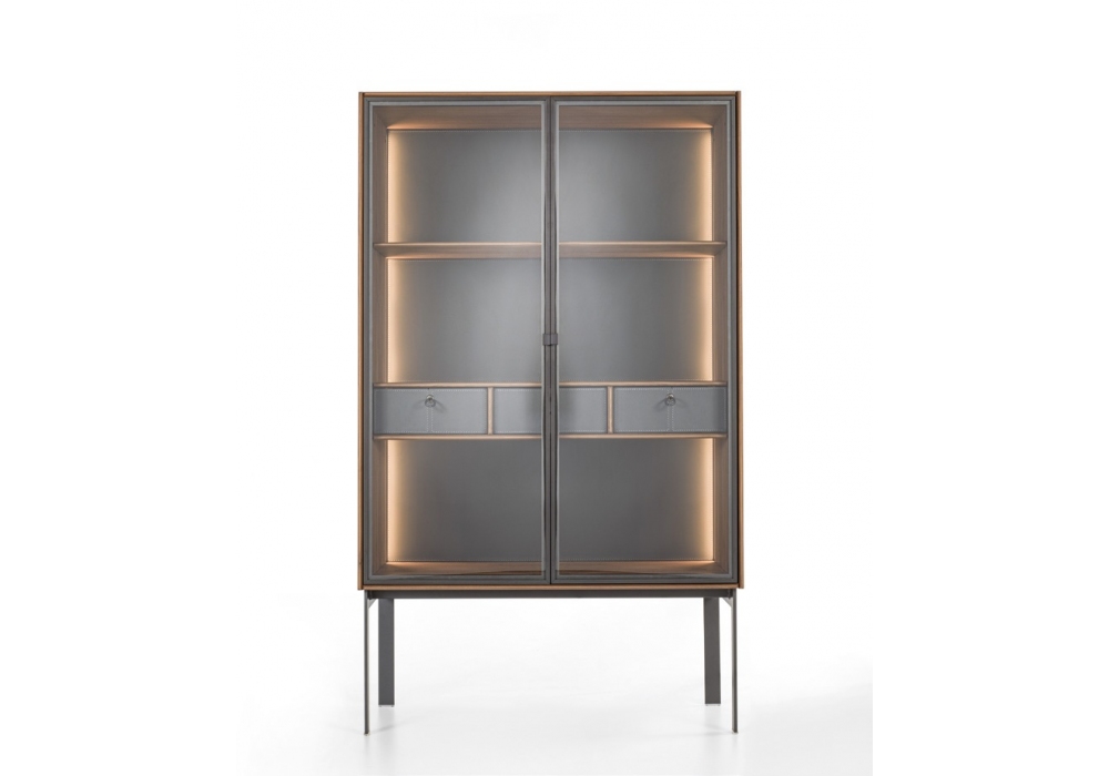 Matics 2 designed by Gabriele & Oscar Buratti for Porada is a sideboard made in Canaletta walnut, open or with Stopsol super light silver glass doors, with metal frame and base in pewter gray finish. Back panel available in wood, embossed bronze metal or Cuoio. Interior equipped with integrated LED lighting dimmable via remote control or APP. Possibility to insert max. three drawers with wooden or Cuoio fronts.