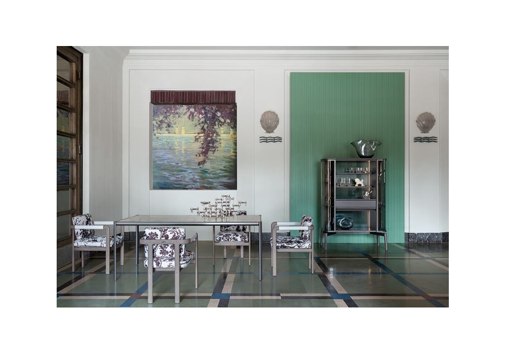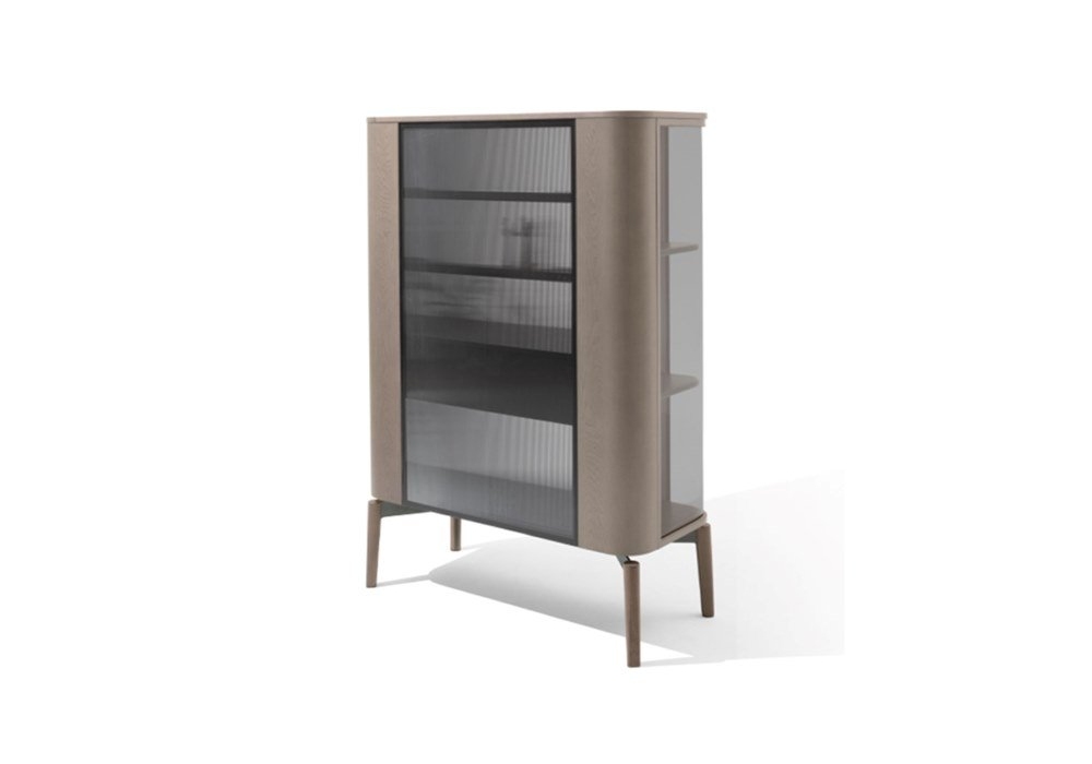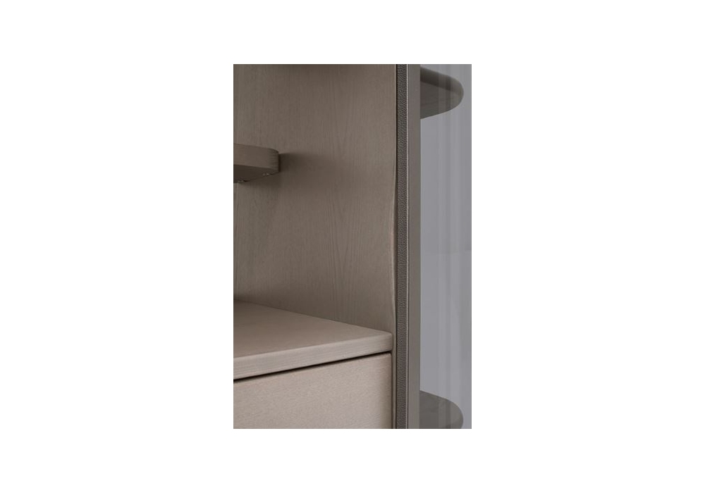 Shibusa designed by Mauro Lipparini for Giorgetti is a storage unit with pewter finish painted metal base, side compartments with shelves and interiors in ash, in different finishes. The doors are equipped with a painted aluminum frame with profiles covered in 9110 gray leather. Available in different models. The top, on the top of the cabinet, is in marble or ash.
