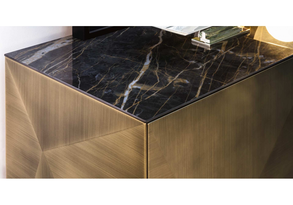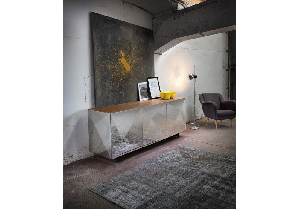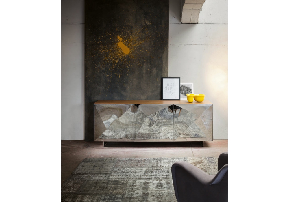 Cubric designed by Riflessi is a sideboard with doors and sides in diamond-bent metal. Interior and back in canaletto walnut. Internal shelves in transparent glass. Push-pull opening. On request it is possible to insert internal drawers and wooden shelves. Available in different dimensions and finishes.