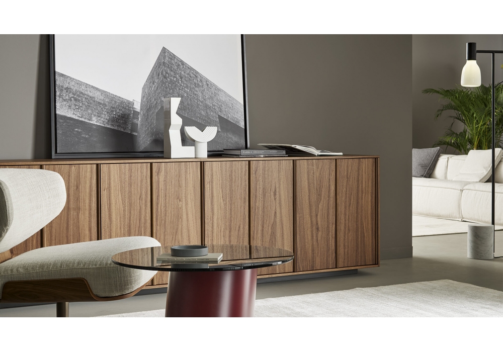 Backdrop designed by Alain Gilles for Bonaldo is a sideboard available in two sizes, with structure in canaletto walnut veneered wood or glossy caramel color lacquered wood. The plinth base is in black metal.