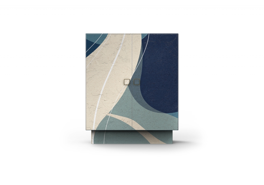 Sharp designed by Studio Debonademeo for Momenti is a two-door Low sideboard made with mdf structure, with matt lacquered interior. Structure with edge inclined at 45 °. External finish and doors: matt lacquered, matt lacquered mortar and molded mortar, covered with printed fiberglass fabric, direct printing glossy lacquered with extra-gloss finish. Protective finish: non-toxic matte and extra-gloss glossy.